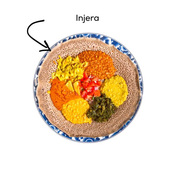 Injera (in-JEH-rah) is the foundation of Ethiopian cuisine. The circular flatbread acts as a utensil and secondary platter for nearly every meal. An assortment of stews, sautéed meats, and braised vegetables sit on top of the injera which is torn into bite-size pieces and used to scoop the dishes with. Meals are traditionally served family style with everyone eating from a massive platter. It's a warm gesture to give the someone you're eating with a "gursha," meaning to hand-feed them a bite of the meal.